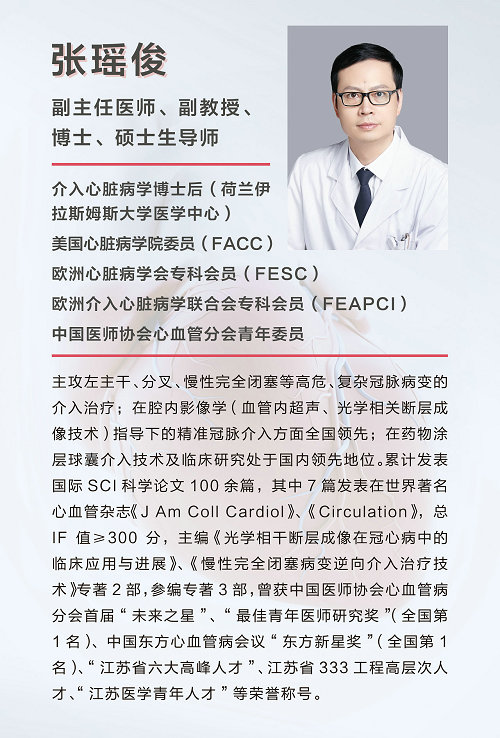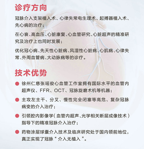 徐州sararz张瑶俊博士心血管工作室是以张瑶俊博士团队为核心,组建的一支反应迅速、技术过硬的冠脉介入治疗队伍。工作室以心内科介入治疗为重点,配有国际水平的血管内超声仪、FFR、OCT、冠脉旋磨术机等机器,为淮海地区复杂、高危冠心病患者的精准介入治疗提供了强力保障。