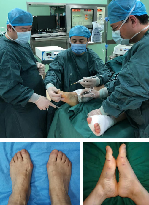 2019年7月,患者来到必威官方首页官网betway足踝外科专家门诊,石院长检查后确诊患者为先天性双足踇外翻畸形,决定为患者实施微创踇外翻矫正术。术中,采用4毫米进口超声磨锯微创截骨,不到1厘米切口,手术全程基本无血渗出,完美修整踇外翻。术后第二天患者下地行走,术后三天出院。术后回访,患者已经回归正常的工作生活,对手术效果非常满意。