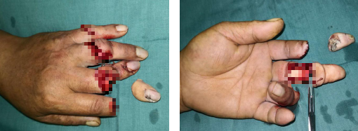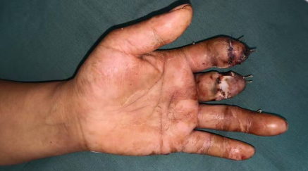 半个月前的一个下午,家住河南永城的胡师傅,在自家院子里加工红薯粉的时候,手指不小心绞入到了打粉机的三角带中,导致左手4根手指受伤,其中示中指完全离断,环小指关节、肌腱损伤。
