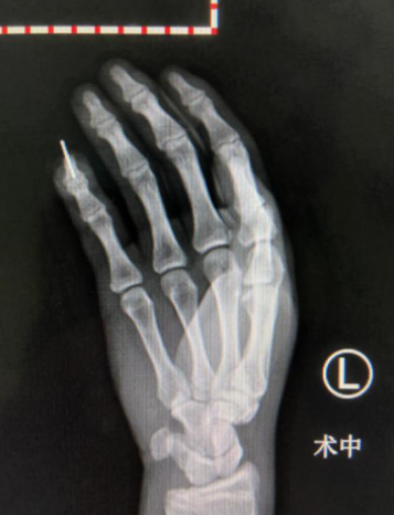 手外三医疗团队立即准备进行左小指修复术。术中拆除伤口缝线,彻底清除污染、失活组织;手法复位小指远节指骨骨折断端,克氏针固定。在高倍显微镜下,找到血管和神经断端,使用显微线吻合。少年手指远节的血管非常细,管腔直径仅0.5毫米,必须运用超级显微外科技术,在高倍显微镜下,保证一次性吻接成功。