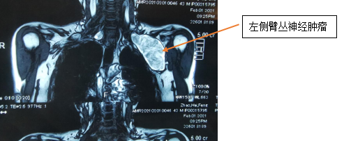 2021年2月初,40岁的张建(化名)找到手外三病区的陈步国主任。“陈主任,您快帮我看看吧!最近一个月,我的左侧肩膀老是疼,手指感觉到有些麻木,我到社区医院看了,针灸、拔罐、理疗,啥方法都用了一遍,一点作用都不起。理疗师理疗时发现我的左胸肿胀,比我右边胸部明显高起来一块,后来我到一家大医院拍了片子,片子上报告说这是神经上的肿瘤,不能轻易做手术,一不小心可能就会胳膊残疾了,这半个月感觉肿块又变大了,我怕是恶性的或者影响我胳膊的功能,想准备做手术,四处打听才找到了您。”