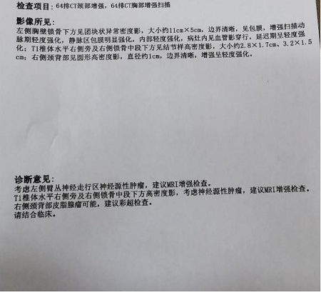 陈主任先安排患者进行相关检查,从体格检查、颈胸部增强CT、超声及磁共振结果来看,考虑患者左、右侧锁骨下肿物的性质为神经源性肿瘤——神经鞘瘤的可能性大。且目前左侧肿瘤已压迫胸腔,锁骨下良性肿瘤多数为神经源性肿瘤,特殊性在于肿瘤位于锁骨下,起源于臂丛神经,与锁骨下动静脉伴行。