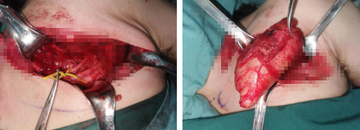 2月4日,手外三团队进行术前讨论,一致认为患者右侧肿物较左侧小,患者右侧肿瘤未影响患肢活动,予左侧臂丛神经肿瘤切除,术后颈部空腔较大,出现皮下淤血,可导致呼吸困难、窒息可能,且肿瘤已压迫胸腔,稍有不慎胸膜破裂,有血气胸形成可能,手术风险较大。由于锁骨下方解剖困难,多数需要切断锁骨,切断锁骨还需内固定,二期再手术取出内固定,对患者造成较大损伤,因此陈主任手术团队制定出另一套损伤小、恢复快的方案——不切断锁骨,直接采取“锁骨上、下联合切口”,通过锁骨上、下切口于锁骨下做通道取出肿物手术方案。