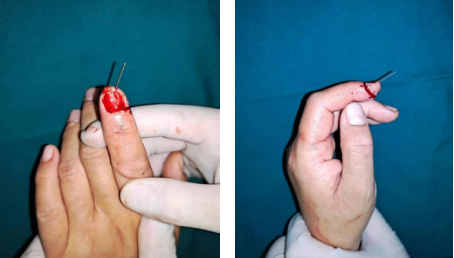 入院当天,李甲、孙传伟医生手术团队为两位患者进行了清创、再植术。术中,手法复位右示指骨折断端,予以克氏针固定。高倍显微镜下,依次吻接示指断裂的血管、神经,修复甲床。手术非常顺利。