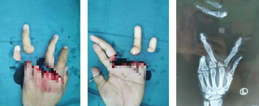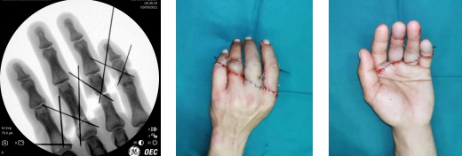 小李被推进手术室,手术团队进行彻底清创,迅速固定骨折,缝合肌腱。术中,由于左中、环、小指部分血管缺损,长度不够,游离血管进行修复。经过7小时的努力,左手示中环小四指全部被接上,手术顺利完成。