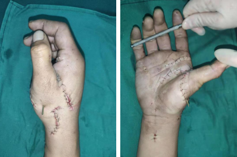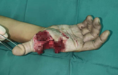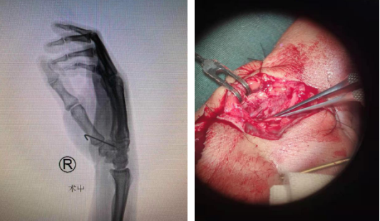 接到电话后,手外科四病区显微修复重建团队郑大伟主任立即为患者检查,张某的右手被炸得肌肉粉碎,手上和身上到处都是白色粉尘,但不清楚其属性。当晚,张某被推进手术室,术中,由于其腕掌关节脱位、手掌血管炸裂,近端血管无法找到,只能进行血管移植改道,在不破坏主干的情况下T字型吻接血管。手术非常顺利,术后张某转回病房。