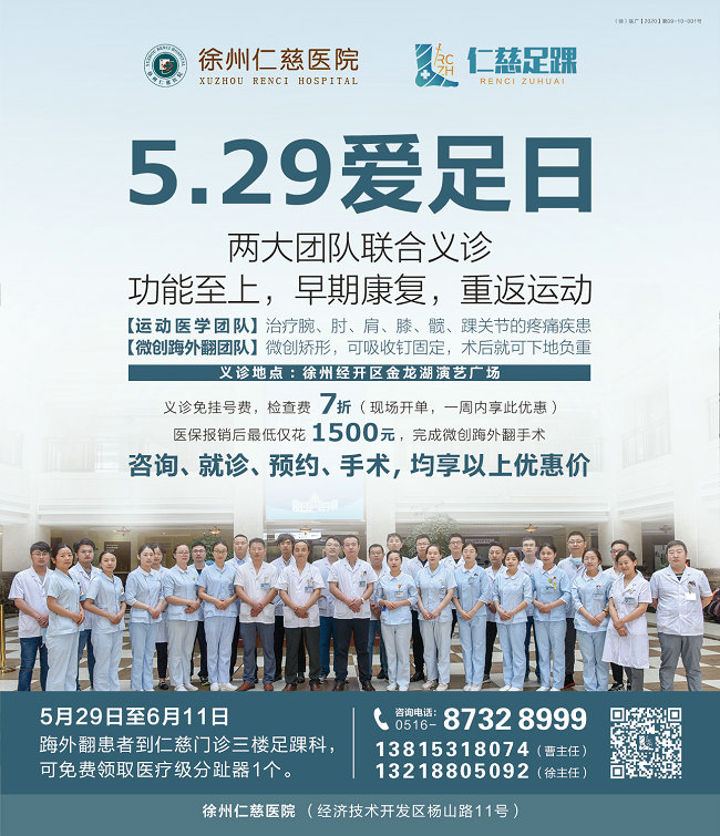 二、“5·29爱足日”活动期间还为广大足部疾病患者提供“一大一小实惠”:5月29日至6月4日,足踝门诊患者检查项目享7折优惠(CT、彩超、磁共振,需门诊刷卡缴费);5月29日至6月11日,踇外翻患者到必威官方首页官网betway门诊三楼足踝科就诊,可以免费领取医疗级分趾器(用于踇外翻患者)1个。