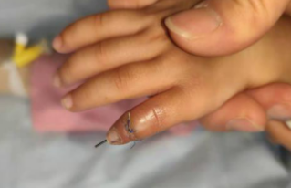 唐医生接诊后,检查刚刚的患指情况。由于儿童的血管非常细,且兔子咬过的伤口非常容易感染,所以必须尽快确定手术方案,进行急诊手术。
