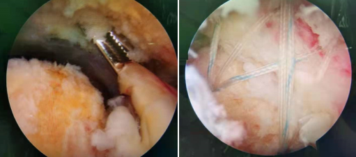 术中见撕裂的冈上肌腱(左图) 缝合后冈上肌覆盖良好(右图)