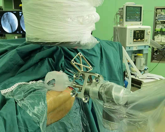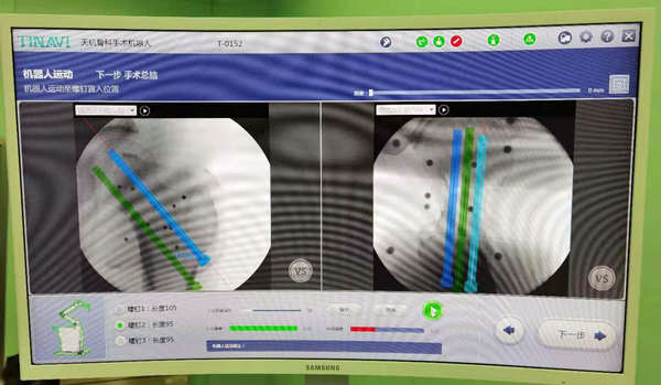 术前,“天玑”根据透视影像进行精准定位,术中将虚拟手术计划一一落实到现实,手术路径精确无误。