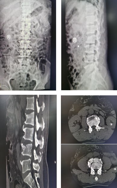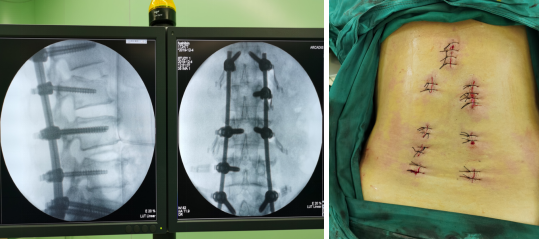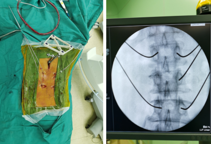 患者是一名55岁的男性,因高处坠落导致 L2、L4椎体骨折,疼痛,难以动弹。脊柱科孟磊副主任医师为患者检查后,和尚军主任进行了严谨的术前讨论,考虑到患者年纪不大,跨节段双椎体骨折,切开复位内固定术需剥离双侧椎旁肌,创伤大、出血多、术后疼痛恢复慢,因此,决定采取经皮椎弓根内固定术,可减少出血和对椎旁肌肉的干扰,有利于早期恢复并下地活动。