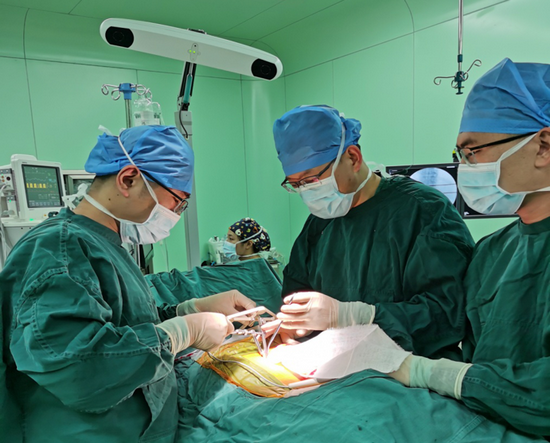 最终,尚军主任孟磊副主任医师团队在骨科机器人定位下,通过3D图像确定手术中椎弓根螺钉的进钉点、置钉方向以及置钉深度。接着,在机器人系统导航下,机械臂精准移动到置钉位置,医生只在置钉部位切开约1.2cm切口,沿着机械臂所指方向钻入导针,并沿导针置入椎弓根即可,从而使椎弓根螺钉能够以最理想化的方式打入,保证了患者的安全和手术的有效性。