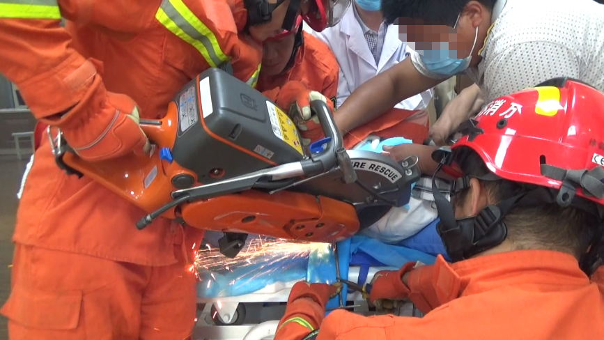 经过半个多小时的紧张救援,钢筋被成功切断。