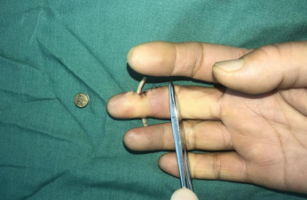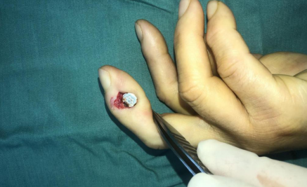 术中探查见锚钉卡压了中指两侧指固有动脉及指固有神经,指深屈肌腱还有部分断裂。吴医生手术团队小心地取出锚钉,缝合了断裂的神经和血管,松止血带后见血管通畅,指端变红润,再缝合皮肤,结束手术。