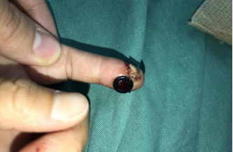 患者张女士与吴女士情况类似,她也是在家干活时,左示指被“纽扣机”打穿手指,张女士忍着疼痛到当地医院就诊,由于当地医院医疗条件有限,张女士又从县区赶到我院。吴贞志医生接诊,查看伤口,见张女士的左示指远节畸形,远节中段有个贯穿伤口,纽扣也被钉在手指内。在完善相关术前检查后,张女士也被推进了手术室。