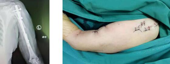 为尽快缓解老人疼痛,在考虑了老人年龄及手术风险后经多学科会诊讨论,与家属充分沟通后在张贯林院长的指导下,麻醉科及手术室人员全力配合下,通过微创技术进行闭合复位髓内钉固定。