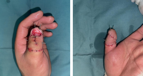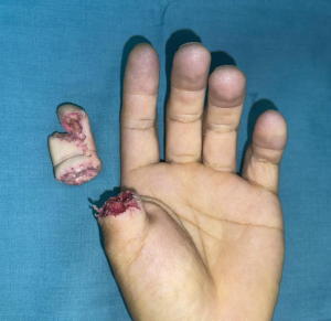 于是,刘先生在家人的陪同下来到了我院,医院急诊开通绿色通道,立即为患者安排手术。进入手术室,手术的主刀医生熊祖国看到离断的拇指,竟然是两平面离断,一平面完全离断,另一平面不完全离断,手术难度还是相当大的。和患者简单沟通后,熊祖国和吴衡医生手术团队便设计出了手术方案。