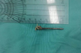 急诊医生深知,这种金属异物在体内多留一分钟就多一分感染的风险,于是当机立断,由口腔科徐晓欣主任主刀,为患者施行 “左下颌清创+异物取出术”,做局部麻醉后,徐主任使用血管钳钳住钉尾,小心拔出,半小时后顺利取出一枚长约5cm带有锈迹的铁钉,并给予止血、消炎、抗感染等积极治疗,以防感染。
