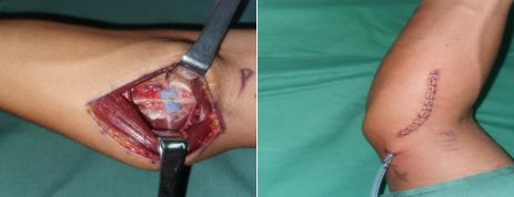 手外三病区陈步国主任接诊后,详细询问了马先生的病史,安排马先生做了上肢全面的专科查体及肌电图、肌腱超声检查。得知患者3月前有呼吸道感染病史,查体发现患者左腕背伸功能正常,左手各指背伸不能。结合肌电图、神经超声检查,陈步国主任初步诊断为:左前臂桡神经病毒性神经炎。考虑患者3个月的保守治疗未见改善,神经没有恢复迹象,同时患者年轻,有着强烈住院手术要求。马先生办理了住院手术治疗,第二天手术顺利,术中见桡神经深支在前臂近端3cm处呈典型“沙漏样”改变或者“腊肠样”改变。修复神经外膜,神经不连续存在,在缩窄处切除约3mm神经,在显微镜下重新吻合。患者术后满意,手指背伸较前改善。