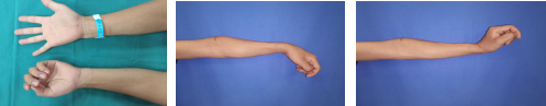 术前检查:左腕背伸正常,左手各指背伸活动不能,屈曲功能可