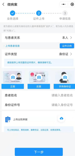 1、申请人为患者本人的,提供患者有效身份证明(身份证正面照、反面照和本人手持身份证照片)和住院凭证;