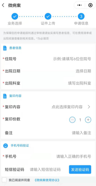 二、微信预约复印病历需要填写患者姓名、住院号、出院时间等信息。并提供一种可以清晰展示患者姓名和住院号的住院凭证,包括:住院证、费用清单、缴费凭证、出院记录、收费发票等。