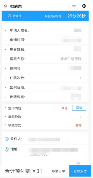 复印病历发送EMS速递,江浙沪皖四省首重12元,其他省区首重一般21元。网上支付完成后,相关工作人员开始病历复印程序,暂不支持退款服务,请慎重申请及付费。