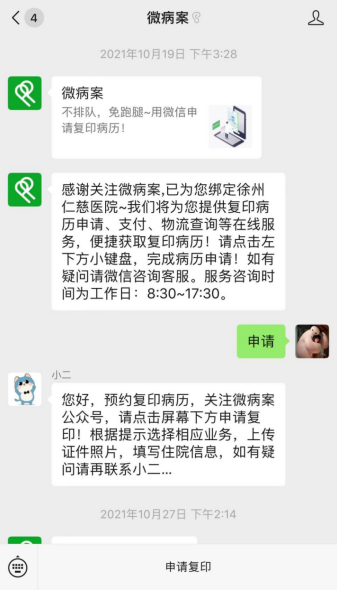 患者或家属通过微信扫码或关注“微病案”公众号。医院审核通过后开始复印并邮寄病历。解决了病历预约复印过程中排队拥挤、填表缴费等候时间较长等不便问题,为患者提供高效、便捷的服务。