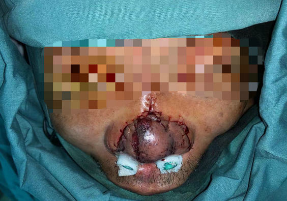 我院急诊科开通绿色通道,紧急联系了显微修复重建外科的郑大伟主任。郑主任视诊发现,患者鼻部软组织自鼻梁经鼻背过双侧鼻翼至鼻小柱撕脱离断,仅两侧鼻翼少许皮肤相连,伤口深达牙龈,与口腔相通,鼻道外露,创面渗血明显,鼻子软骨末端骨折伴部分缺损,离断组织色瘀紫。虽然患者“再植条件”一般,手术难度很大,但是一个人如果缺了鼻子,他很有可能会丧失生活的勇气和信心,甚至无法面对他人,无论是工作还是社交都会变得困难。患者家属也十分着急,请求郑主任无论如何一定要帮张大爷接上鼻子。但是相较于断指再植手术而言,断鼻再植技术难度更大,鼻子的血管更细,口径约0.3毫米,普通的显微外科也难以完成吻合,必须借助超级显微外科技术,进行血管吻合完成鼻再植。看着患者期待的眼神,郑主任决定尽最大努力帮助张大爷保住鼻子。