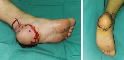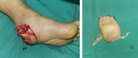 入院后,患者的保足诉求非常强烈,然而足部组织块再植的难度比手组织块再植技术难度更大。如果选择再植方案,第一,患者左足后跟创面挫伤污染严重,离断组织块内血管不恒定,不好找血管,需要在超级显微镜下进行探寻和吻合;第二,由于足部距离心脏较远,足跟部的再植成活率很低。如果舍弃再植择期再造,手术的常规设计是从小腿取游离皮瓣,覆盖足跟,只能起到改善外观的作用,但不是最理想的结果。因为足底皮肤无可取代,其耐磨性好、敏感性高,任何皮肤都不可与之相媲美。两难之下,经与患者沟通,患者决定试一试再植。