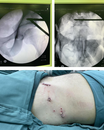 术中,于左侧股骨髁上置入骨牵引针,连接下肢牵引架。在C臂机透视下牵引左下肢撬拨复位,在天玑骨科机器人导航下置入固定左侧骶髂导针,透视见导针位置长短适中,螺钉固定,手术切口不到1公分。