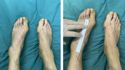 术前,张大妈双足负重位正侧位X线检查显示:双足拇外翻,双侧扁平足。