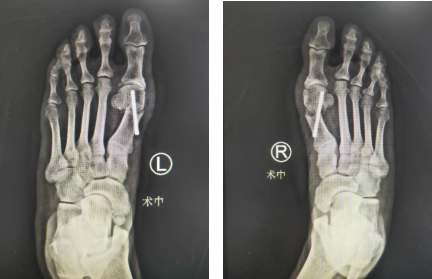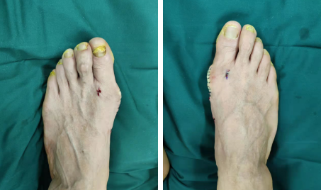 经术前充分准备,石荣剑、陈占斌、胡帆手术团队术中先行右足拇外翻微创截骨矫形术,取第1跖趾关节背外侧纵行切口长约2cm,使用微创专用勾刀松解肌腱,在第1跖骨头内侧取纵形切口长约1.5cm,切除踇囊、松解跖趾关节囊韧带,分离截骨线周围骨膜、“V形”截骨推移,进行内固定。同法处理左足拇外翻畸形,手术顺利,1个半小时就完成了双侧矫形。