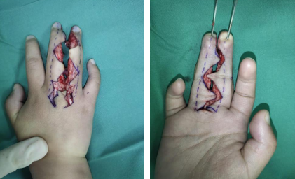 萱萱入院后,滕医生医疗小组为患儿进行了并指分指术。术中于右中环指掌侧、背侧各设计一连续“Z”字切口,于中环指掌指关节背侧设计一近似五边形皮瓣,掌侧设计“Y”形切口。切开皮肤,保护指固有动脉及神经束,形成带蒂筋膜皮瓣,将右中环指并指完全分开,充分减容,切除多余脂肪组织,于右足内侧切取同右中环指残留创面等大皮片,覆盖创面直接缝合。手术顺利。