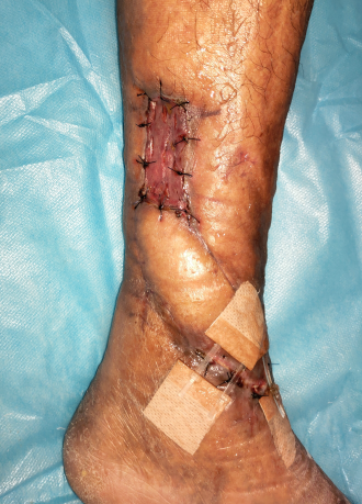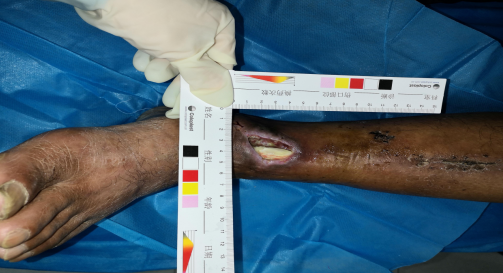 吕大爷18年的时候,因外伤致左小腿骨折在当地医院进行骨折复位内固定手术,终于可以拆内固定了,满心期待自己能重新站起来。术后却发现切口愈合不良,在门诊换药效果不明显,然后越来越来大,已经能看见胫前肌腱了。