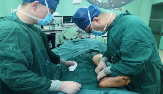 术中,根据创面缺损的大小、形状设计皮瓣并划线标记,医生游离血管蒂长度满足受区要求、血供良好的皮瓣,移植到脚部的残损创面,在显微镜下细致吻合血管、神经。皮瓣供区则直接拉拢缝合,将来不会影响腿部的使用功能。
