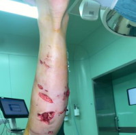 另一名小女孩被自家犬咬伤双下肢,急诊予创面清创包扎后,并肌注狂犬疫苗、免疫球蛋白及破伤风免疫球蛋白,后行“双下肢外伤清创+创伤负压套装留置术”,目前还在进行治疗中。