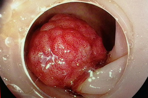 无痛肠镜检查后,距肛门约30cm处发现一个巨大球形长蒂息肉样隆起,如草莓般大小,表面糜烂并伴少许渗血。