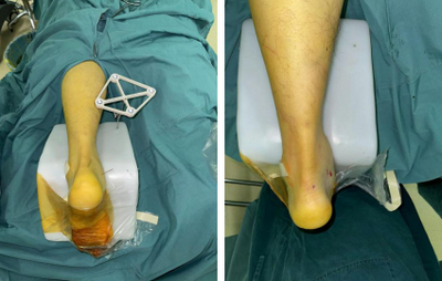 入院第二天,石荣剑副院长、曹广超主任、周吉医生手术团队为患者进行了“左踝关节镜下探查清理+机器人辅助下距骨骨折复位内固定术”。术中于左踝后方内外侧两旁各取1cm纵行切口,钝性分离组织,向关节腔内放入关节镜镜头,探针探查见增生、水肿、炎性增生的滑膜,距骨内上缘软骨损伤,内侧三角韧带部分撕裂,刨刀去除增生、水肿的滑膜,去除损伤软骨。探查见距骨内侧及后侧骨折,局部粉碎,断端移位,用机器人辅助定位确定固定距骨2处骨折端螺钉方向,钉入2枚克氏针导针,并沿导针钉入2枚全螺纹空心螺钉,修复内侧三角韧带,C型臂透视见距骨骨折端对位对线良好,内固定在位。手术顺利,术后患者安返病房。