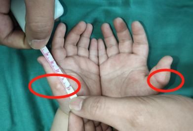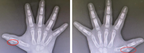 今年1月初,一位妈妈带着孩子来到小儿骨科门诊,妈妈告诉接诊的贺敬坤医生,小孩双手大拇指都出现一个圆疙瘩,摸着硬硬的,以前很小,现在小孩长大了它们也跟着长大了。当时贺医生心里十分警惕,这些症状和骨肿瘤症状很相似,难道是手部骨肿瘤么?但随着和家长交谈、询问病史、仔细查体后这份疑虑慢慢放下了,原来孩子自出生时双手拇指均多出一根手指,当时家长内心十分焦虑。随后在孩子出生十几天后,他们选择做了多指的切除手术,本以为把这些不美好扼杀在摇篮里了。然而却没想到随着年龄的增长,到孩子1岁时,妈妈发现其双手拇指桡侧又各长出一圆形凸起,并伴随孩子生长发育一起生长,程度逐渐加深。到孩子5岁时更加明显,妈妈十分担心,经过多方打听后决定来到我院希望得到更好的治疗,最后通过完善相关检查确诊为左拇指畸形IV型,右拇指多指畸形III型。