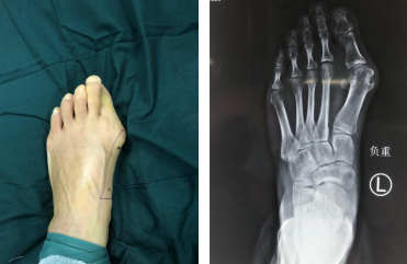 35岁的张女士10年前发现双足拇外翻畸形,前足增宽,未予重视。随时间增长,双足拇外翻畸形程度逐渐加重,拇囊突出,不能长时间负重行走及久站。近1年双足负重行走时足底疼痛明显,左侧症状较重,为进一步治疗,来我院就诊,门诊拟“双足后天性拇外翻畸形”收治入院。