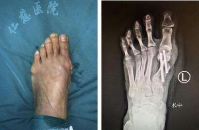石荣剑副院长、曹广超主任、赵亮医生团队为患者行左足拇外翻矫形手术。术中于左足第一跖骨头端内侧做一长约5毫米微小切口,利用超声骨刀行跖骨远端外移截骨,远端向外侧推移、向跖侧下压,使用全螺纹空心螺钉固定。术后患者恢复良好。