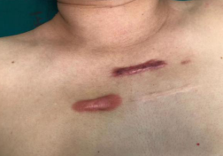 接诊后,betway在线登陆烧伤整形科黄振主任,仔细询问并查看胡女士颈胸部的疤痕,经过仔细探查,发现胡女士颈胸部两处疤痕疙瘩长约4-5公分、宽约1.5公分,并且充血严重,诊断为颈部疤痕疙瘩。