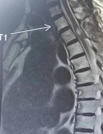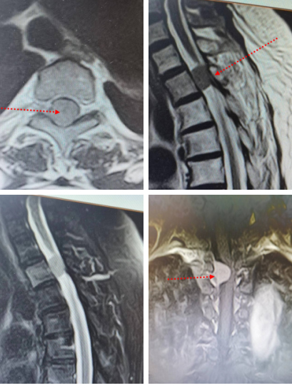 患者彭女士,自三月以来感觉自己双下肢麻木无力且运动及感觉障碍逐渐加重,脊髓核磁共振检查证实为胸2段椎管内肿瘤,遂收住入院。经MR增强扫描后发现异常信号,均匀强化明显并出现类似脑膜尾征,脊髓受挤压变薄,考虑为脊膜瘤。