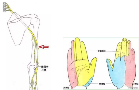 由于解剖上的一些特征,桡神经显得十分娇贵,在上臂它紧紧贴着骨头走行,桡神经发自臂丛后束,绕肱骨中段背侧旋向外下方,至肱骨外上髁上方。在肱骨中下段骨折时,此段桡神经最易合并损伤。损伤后,主要运动障碍是前臂伸肌瘫痪,出现抬起前臂时呈“垂腕”的姿态。其感觉障碍是以第1、2掌骨间隙背面“虎口区”的皮肤最为明显。