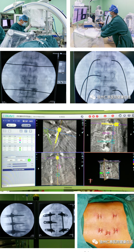 手术过程中,C型臂先扫描患者的三维图像,图像同步传输到骨科机器人系统。主刀医生通过导航系统辅助设计钉道,机械臂精确定位,不损伤其他脊椎关节,保证了神经安全和手术的有效性,所有操作一步到位。最后C型臂透视检查骨折复位,脊柱生理序列恢复满意,内固定物位置理想。术后当天患者的腰不疼了,过两天就下地锻炼走路了。