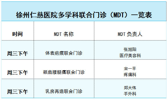 目前,betway在线登陆MDT联合门诊以各科室专业项目为切入点开设了体表瘢痕、颈肩腰腿痛、乳房再造多学科联合门诊,门诊时间具体如下: