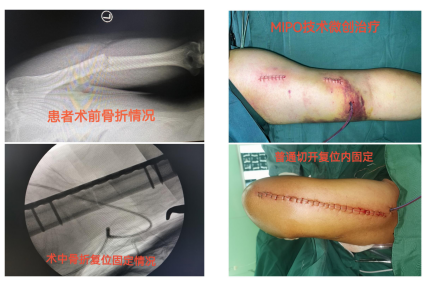 相较于传统手术,MIPO技术是微创接骨板技术,不切开骨折断端皮肤,在远离断端部位切开很小的刀口,通过骨膜外皮下隧道进行骨折固定,不破坏骨膜血供,钢板经皮插入,形成桥接固定从而充分保护骨折部位的生物环境,不暴露桡神经和减少医源性桡神经损伤发生风险,有利于骨愈合,减少患者的住院及术后恢复时间。