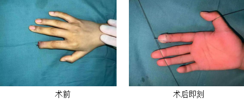 确定好具体手术方案后,由郑大伟主任手术团队为文文进行“右示指清创再造术”,指尖再植的手术对医生的技术要求非常高,术中探查见断掉的血管、神经仅有0.3mm~0.4mm,在20倍显微镜下,通过一系列的剖开、切取、移植、接通、缝合等动作后,再造示指指体色红润,毛细血管反应灵敏,手术顺利结束。