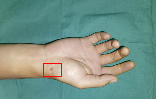 术后,伤口非常小,仅能看见一个钉眼,小张及其家人非常满意。